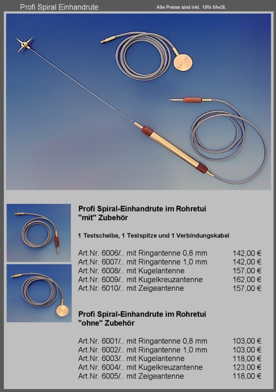 Die Eingangssignale werden auf Grund der Spiralwendel im Inneren des Handgriffes extrem verstärkt und reagieren dort entsprechend empfindlich. Bei herkömmlichen Ruten ist da oft kein Ergebnis mehr zu sehen, wo die Profi Rute erst anfängt. Ein metallener Handgriff, der trotz des hohen spezifischen Gewichtes von Messing ein "Leichtgewicht" mit gerade mal ca. 40 Gramm ist. Auf Grund der besseren Leitfähigkeit werden die Griffe nicht lackiert. Suchen Sie sich Ihr Lieblingsholz anhand der Farbkarte aus.
